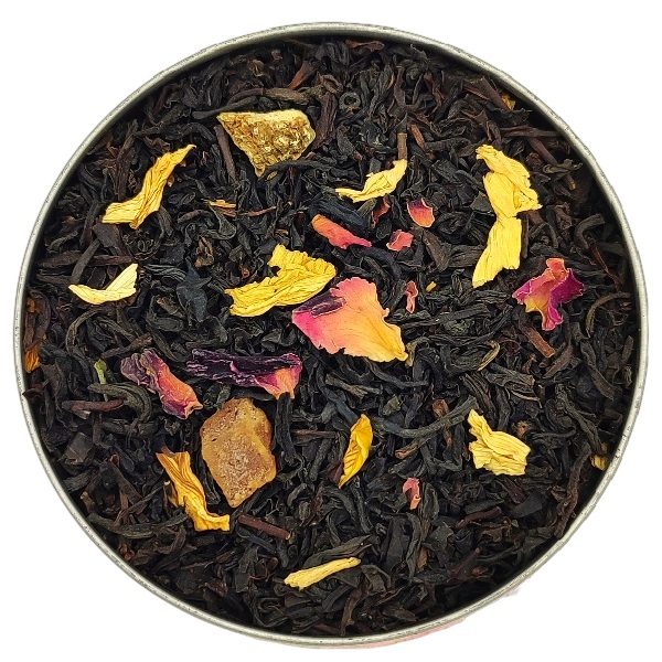 Composition: thé noir, arômes, pétales de mauves, pétales de roses, cubes de mangue (mangue, sucre), pétales de tournesol, éclats de mangue, écorce de citron.